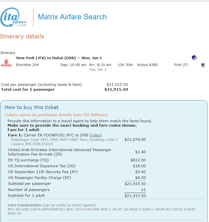 Until recently, JAL did not impose fuel surcharges on Emirates award flights. Now, for a one-way flight from New York to Dubai, JAL will charge over $800 for fuel surcharges on award flights booked in either business or first class. You can approximate the fees that JAL will charge on Emirates award flights by using ITA Matrix.