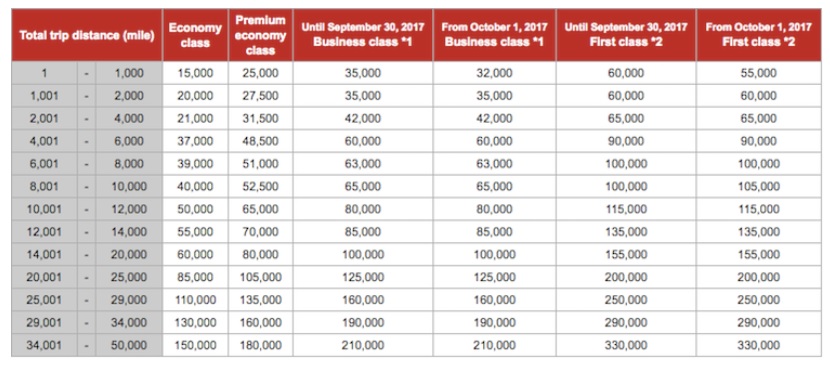 JAL recently increased the amount of miles required to book some award flights but the changes were relatively minor. By calculating the total distance of your desired partner award flight (I use milecalc), you can figure out how many miles JAL will charge. For example, a one-way flight from IAD (Washington DC) to MLE (Maldives) on Emirates (layover in DXB – Dubai) is 8,953 miles. A business class ticket would cost 65,000 JAL miles (plus over $800 in fuel surcharges). Here’s JAL’s partner award chart: