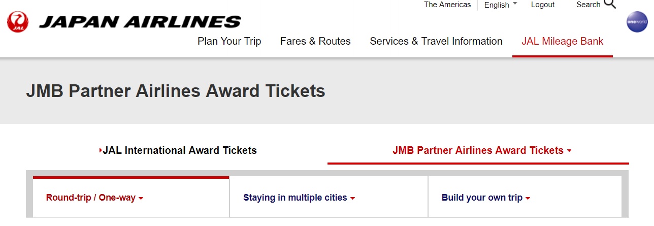 Select “JMB Partner Airline Award Tickets” to book an award flight. Only the following partner award flights can be booked online: